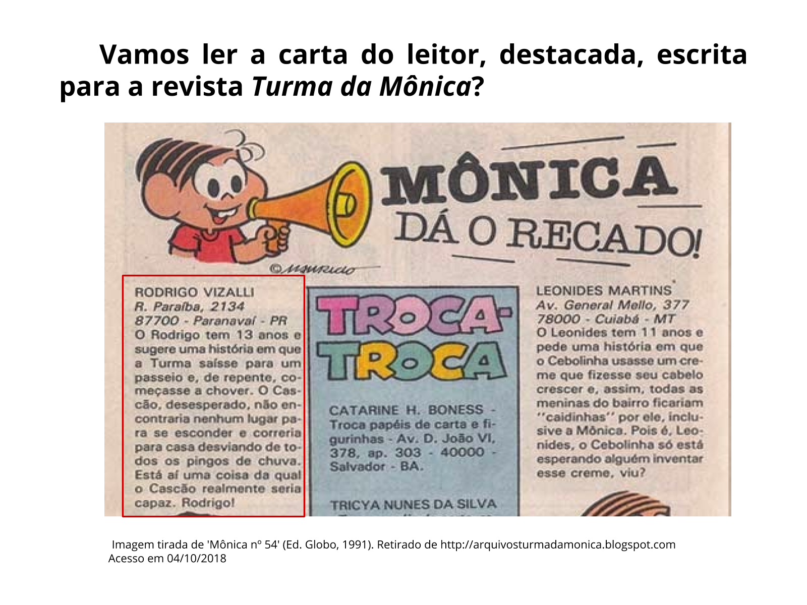 E que para alguém escrever carta a outra pessoa é preciso saber um pouco sobre essa pessoa. Espera-se que os alunos respondam que na carta uma há uma sugestão de um menino para uma história da Turma da Mônica. Dirá que nesta aula vão escrever cartas a personagens da turma da Mônica.